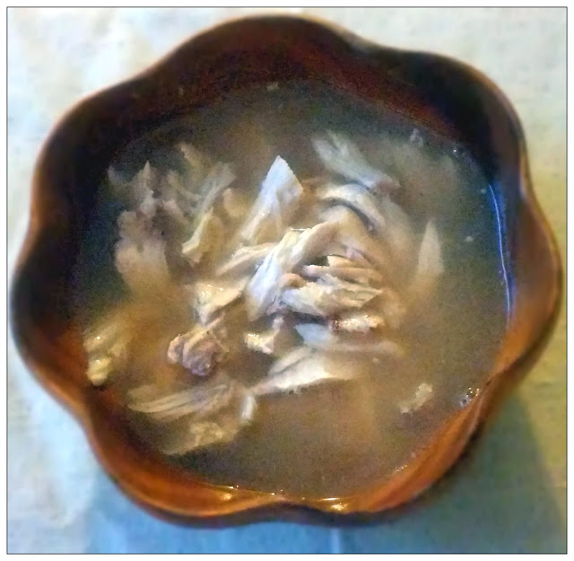 Add your wine, cloves, mace, pepper and cinnamon to your stock and heat on low. While the broth is heating remove the skin and bones from your chicken and cut your chicken into bite sized pieces. Once the broth has heated for approximately 15 minutes, remove the cloves, and slowly stir in your bread crumbs 1 tablespoon at a time. If the bread clumps your sauce will get chunky and that's not pleasant. Trust me! Stir in the vinegar, and keep your broth on low heat until it thickens to your desire. Mine was the consistency of a thin white sauce.